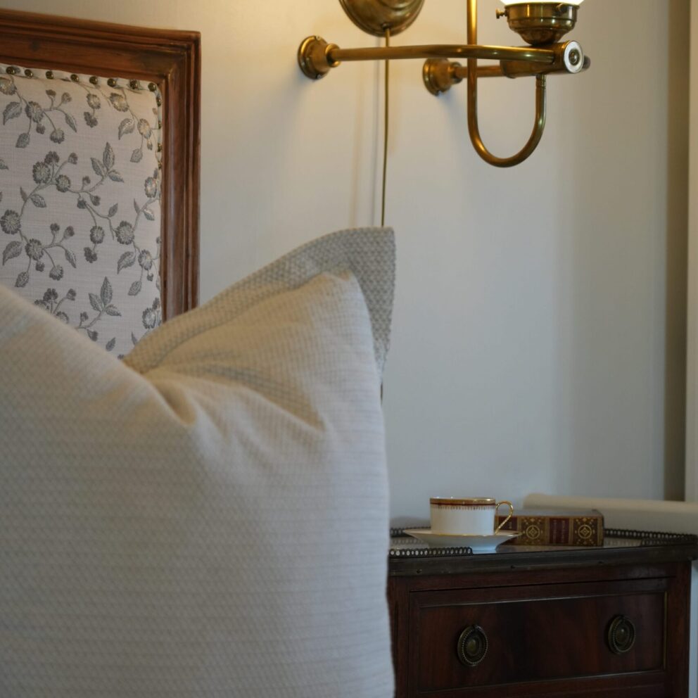 A decidedly Art Deco motif silhouetting the hand carved headboard reminds guests to pursue beauty in all aspects of life. The hand painted gold swans on the wall are repeated in the bronze ormolu Empire chandelier above. Meanwhile, the bathroom lends a contemporary touch. The hexagon pattern on the floor–a modern interpretation of geometric designs […]