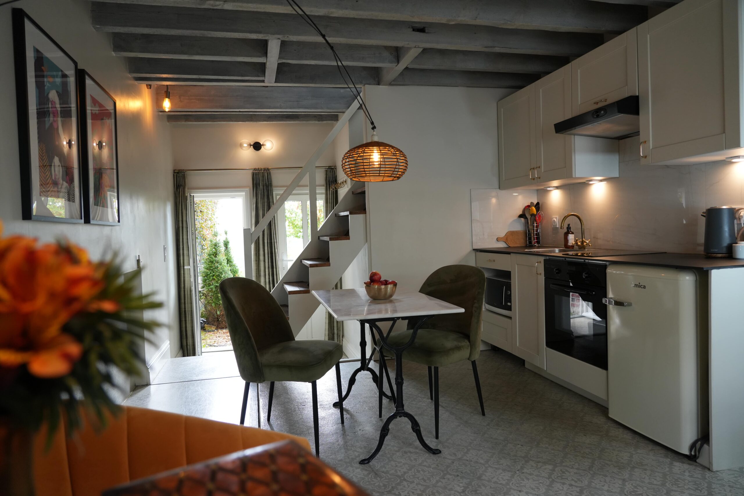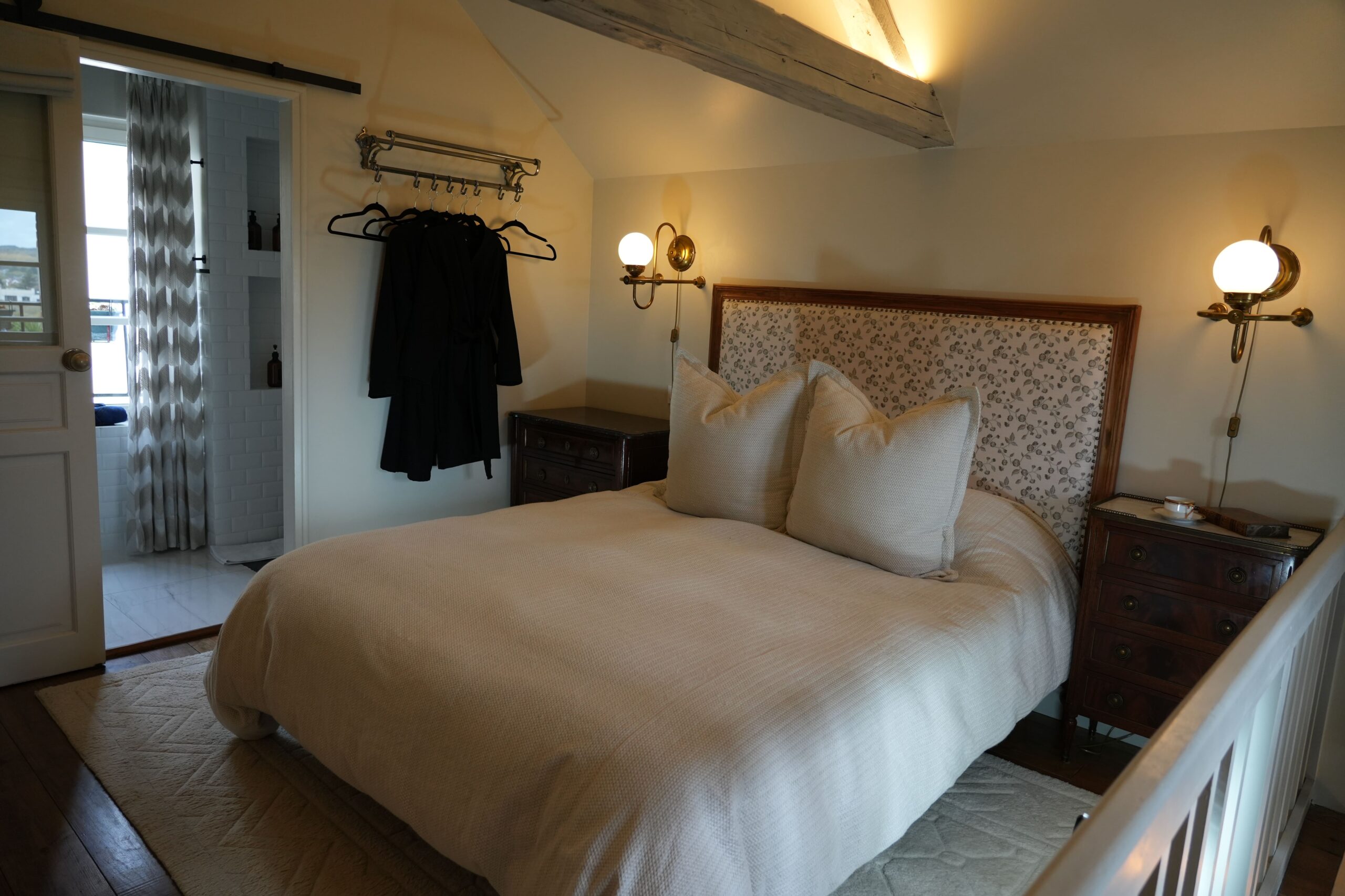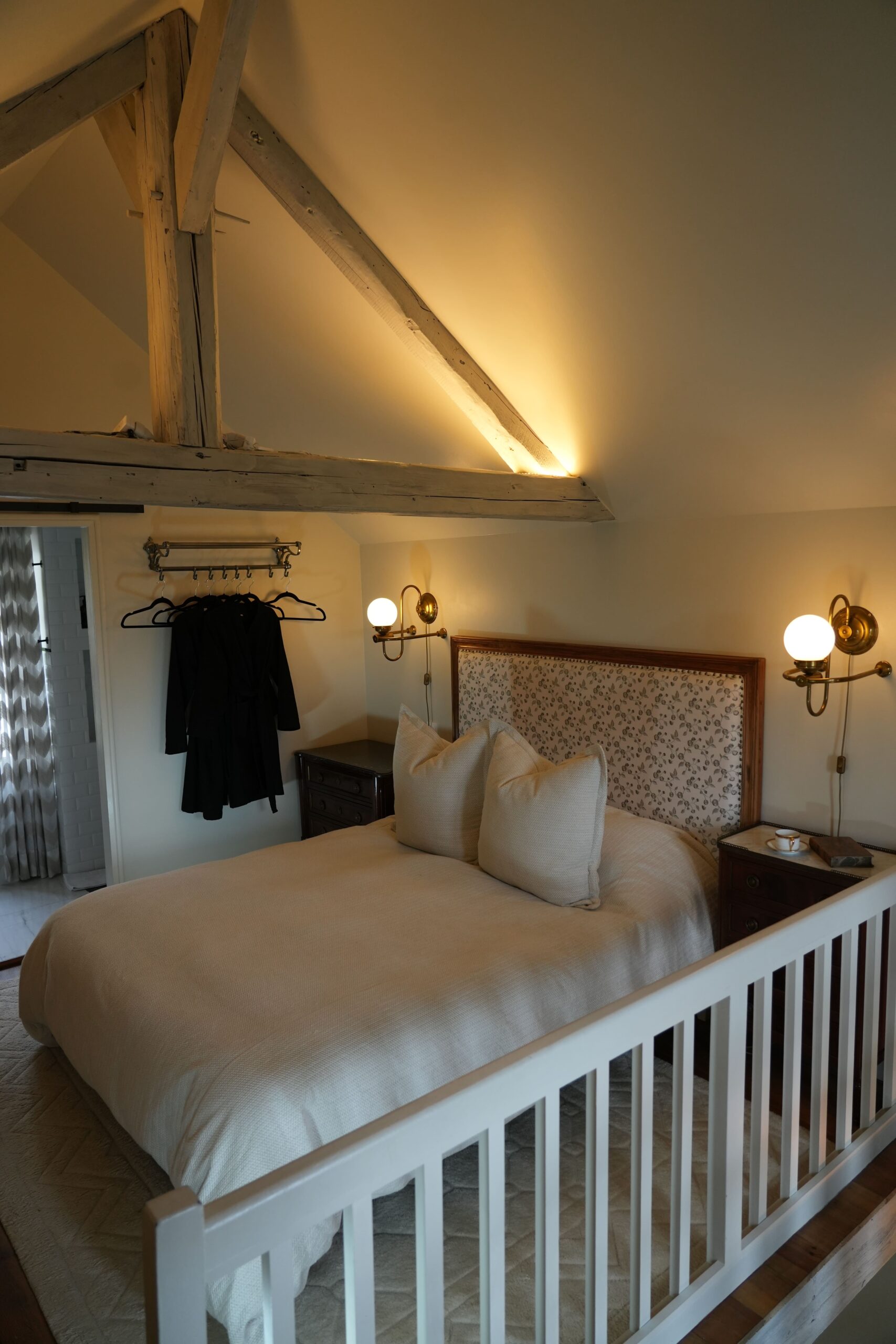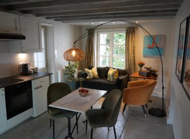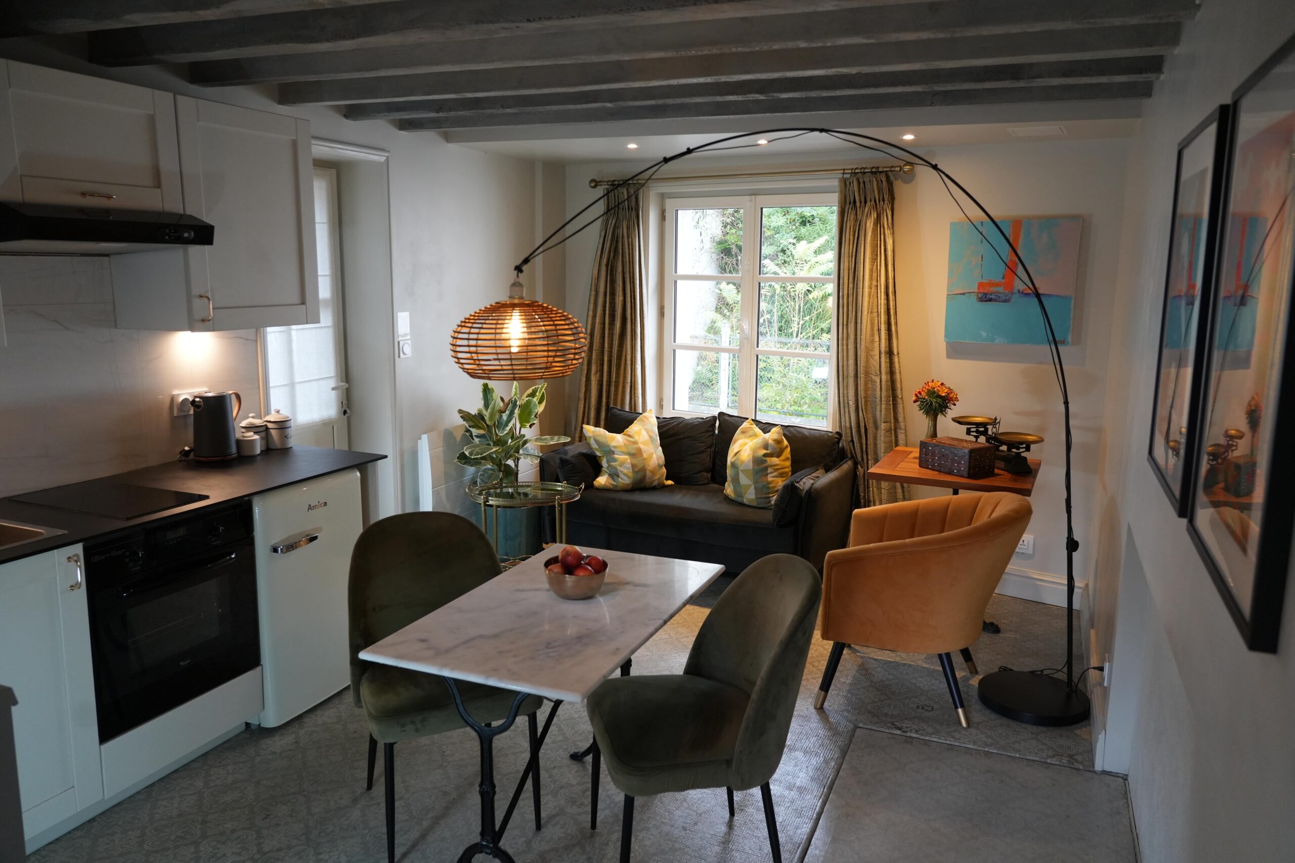 Originally the service quarters, this completely renovated two-story private cottage maintains its original rustic charm. The open floor plan on the ground floor has a cozy aesthetic. To keep the space light and airy, the exposed wood beams were covered in a traditional lime wash. The private entrance and kitchenette allow guests total independence while direct access to the classic French garden affords sweeping views of the Loire Valley. The vaulted ceiling in the bedroom suite upstairs gives the impression of spaciousness. A small bathroom features an Art Deco period vanity and modern walk-in shower.