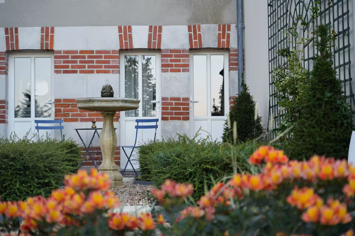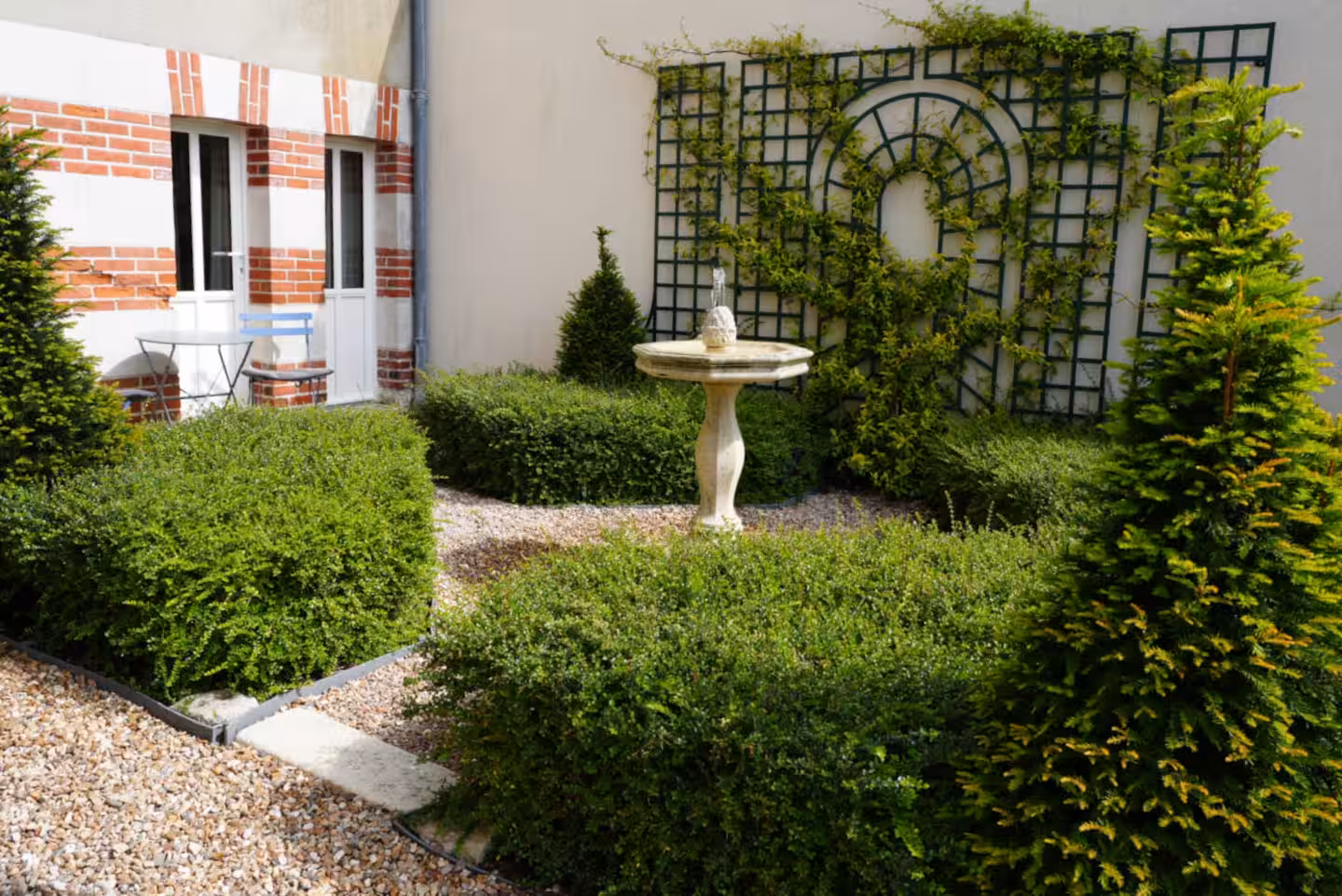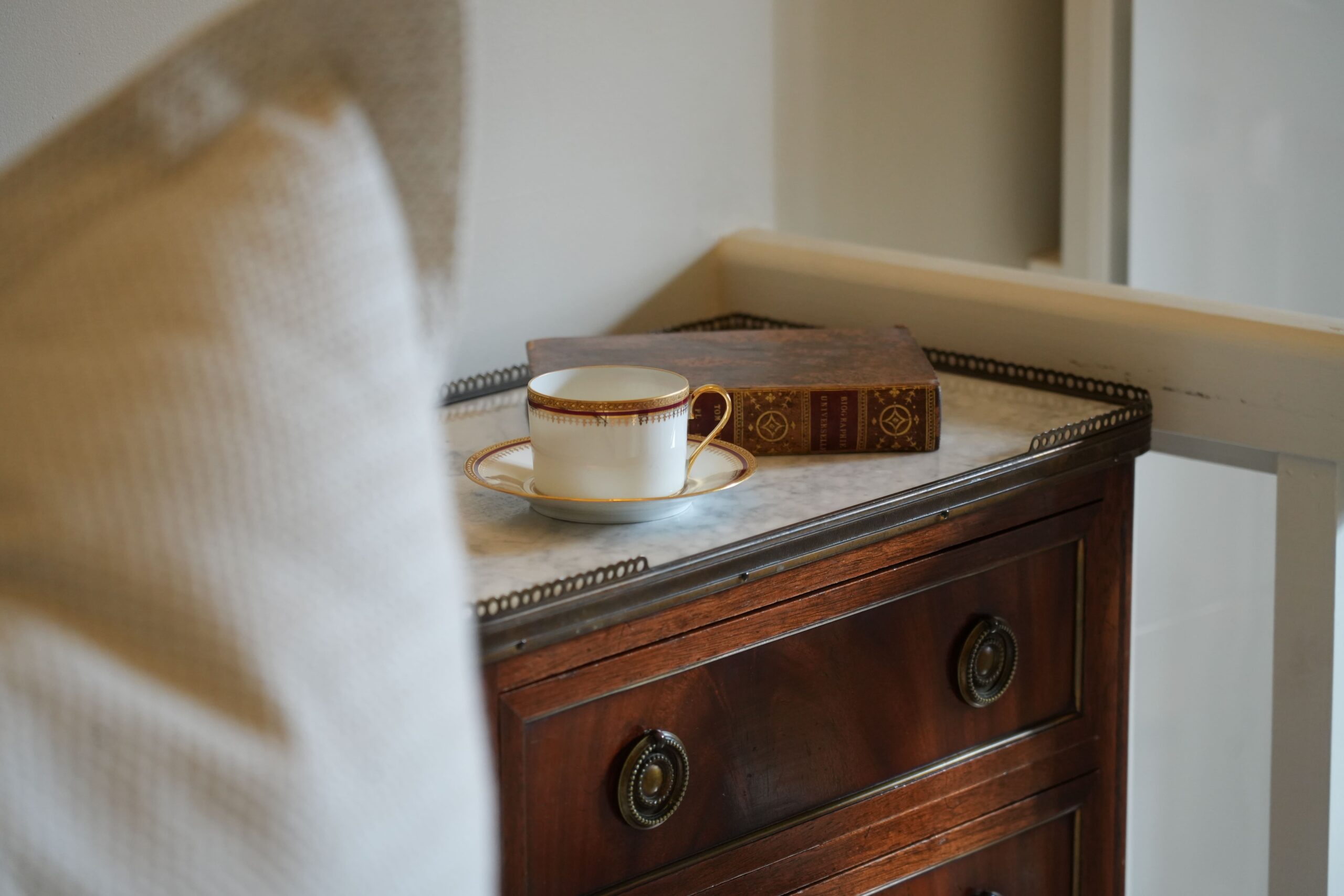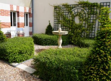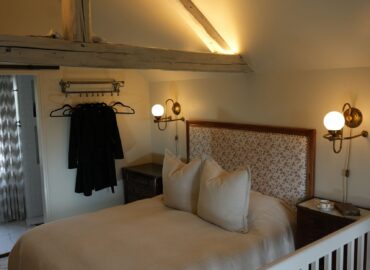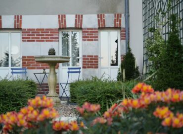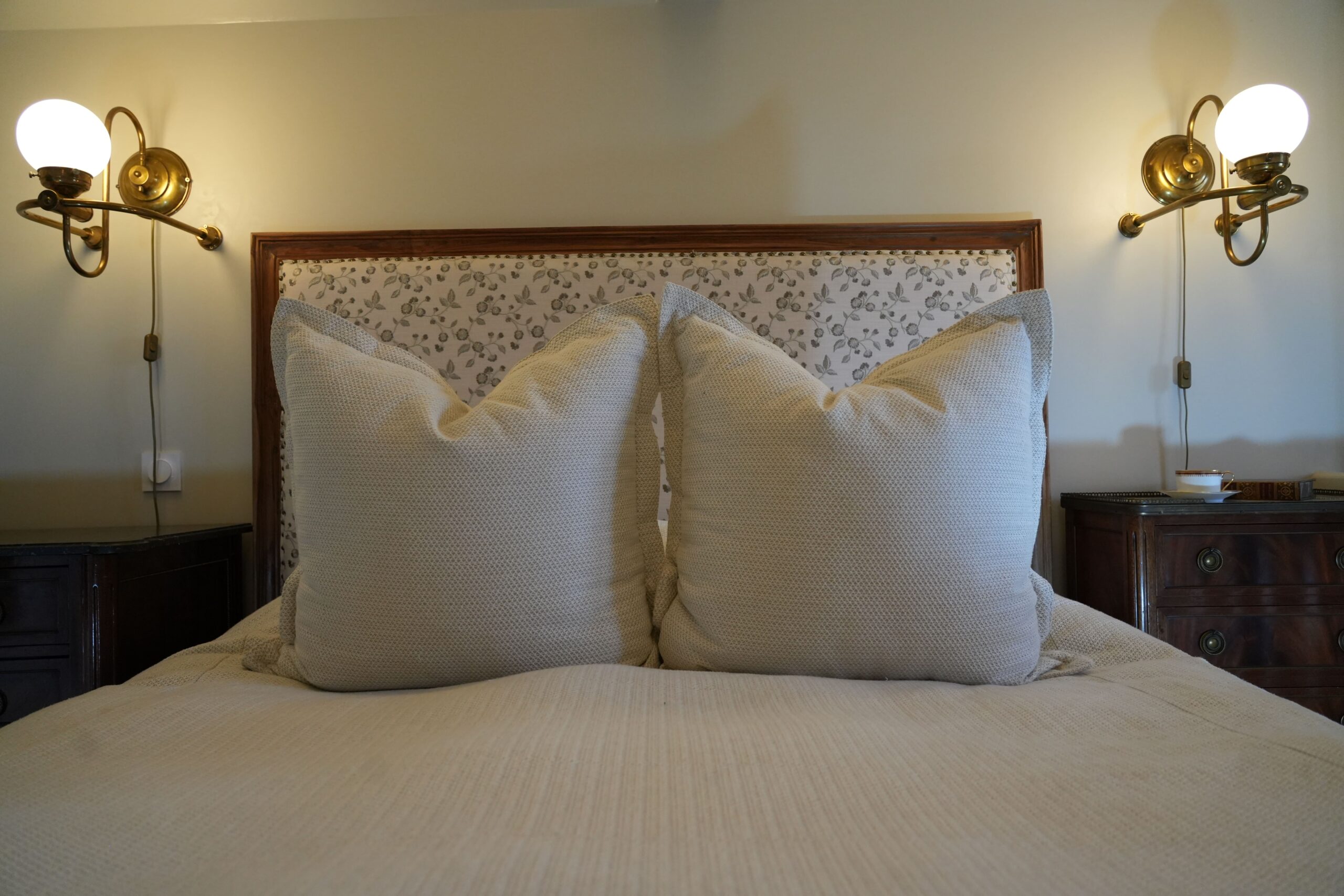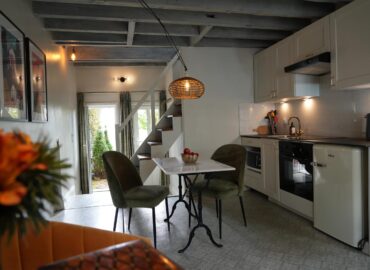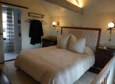 Originally the service quarters, this completely renovated two-story private cottage maintains its original rustic charm. The open floor plan on the ground floor has a cozy aesthetic. To keep the space light and airy, the exposed wood beams were covered in a traditional lime wash. The private entrance and kitchenette allow guests total independence while direct access to the classic French garden affords sweeping views of the Loire Valley. The vaulted ceiling in the bedroom suite upstairs gives the impression of spaciousness. A small bathroom features an Art Deco period vanity and modern walk-in shower.