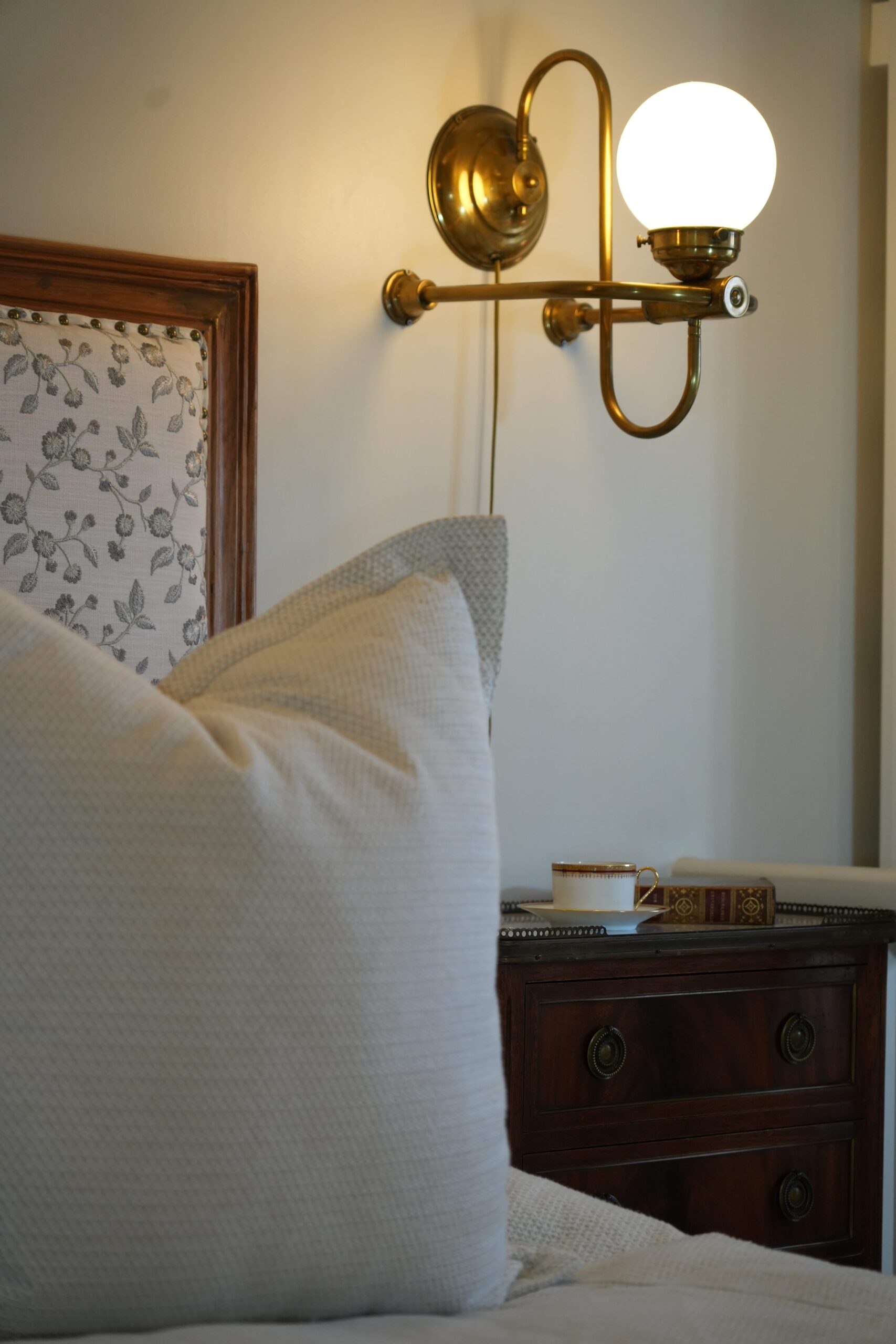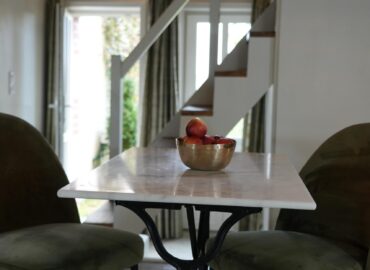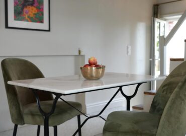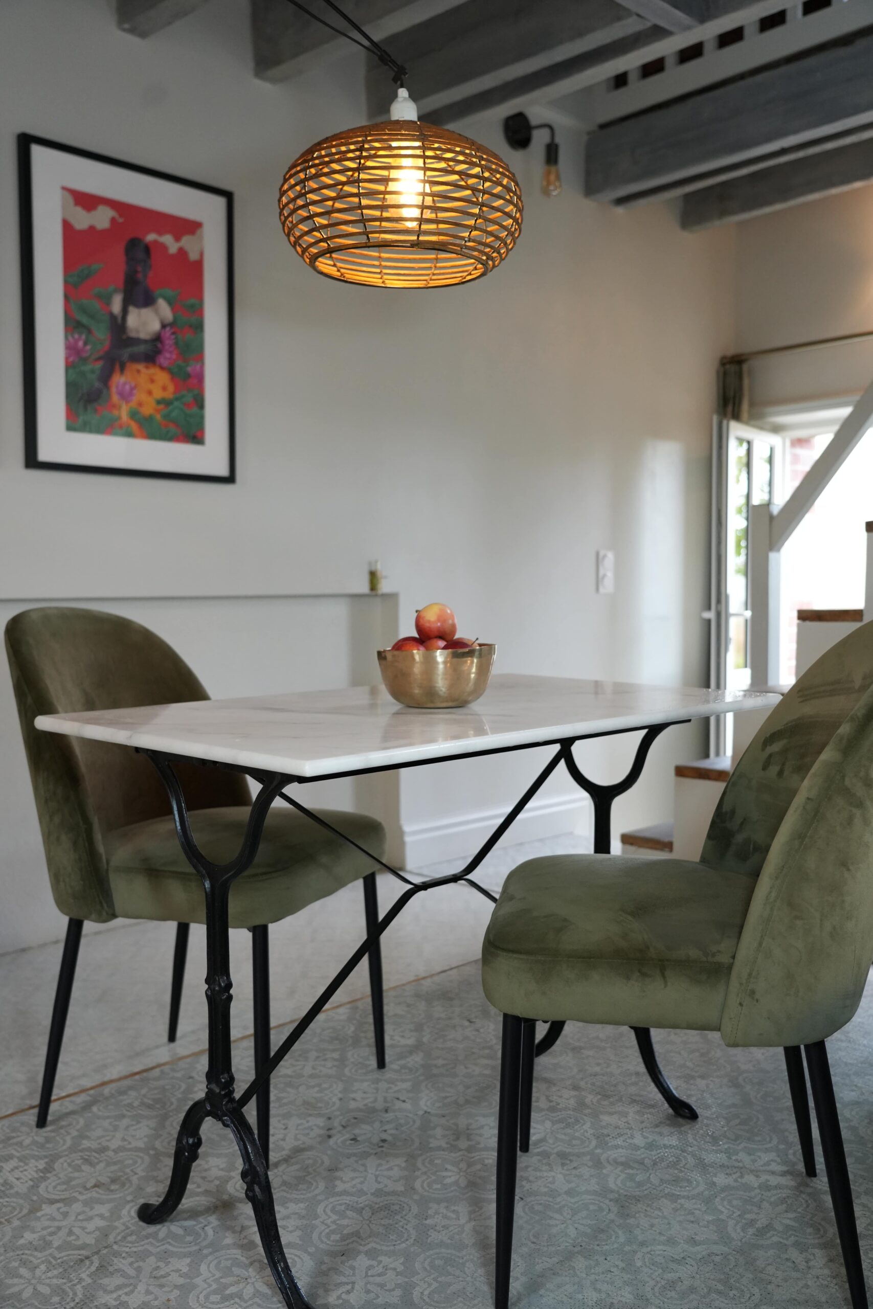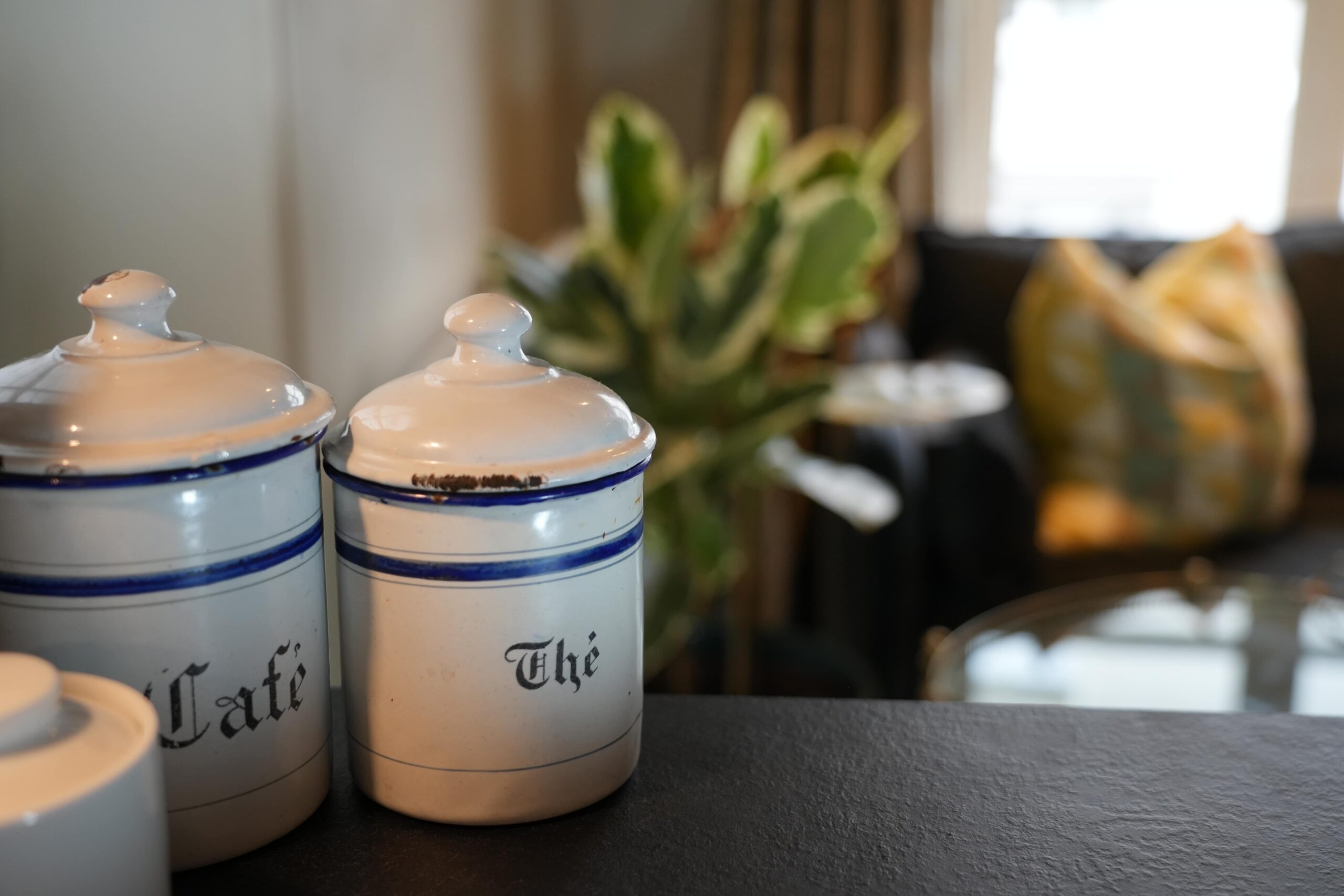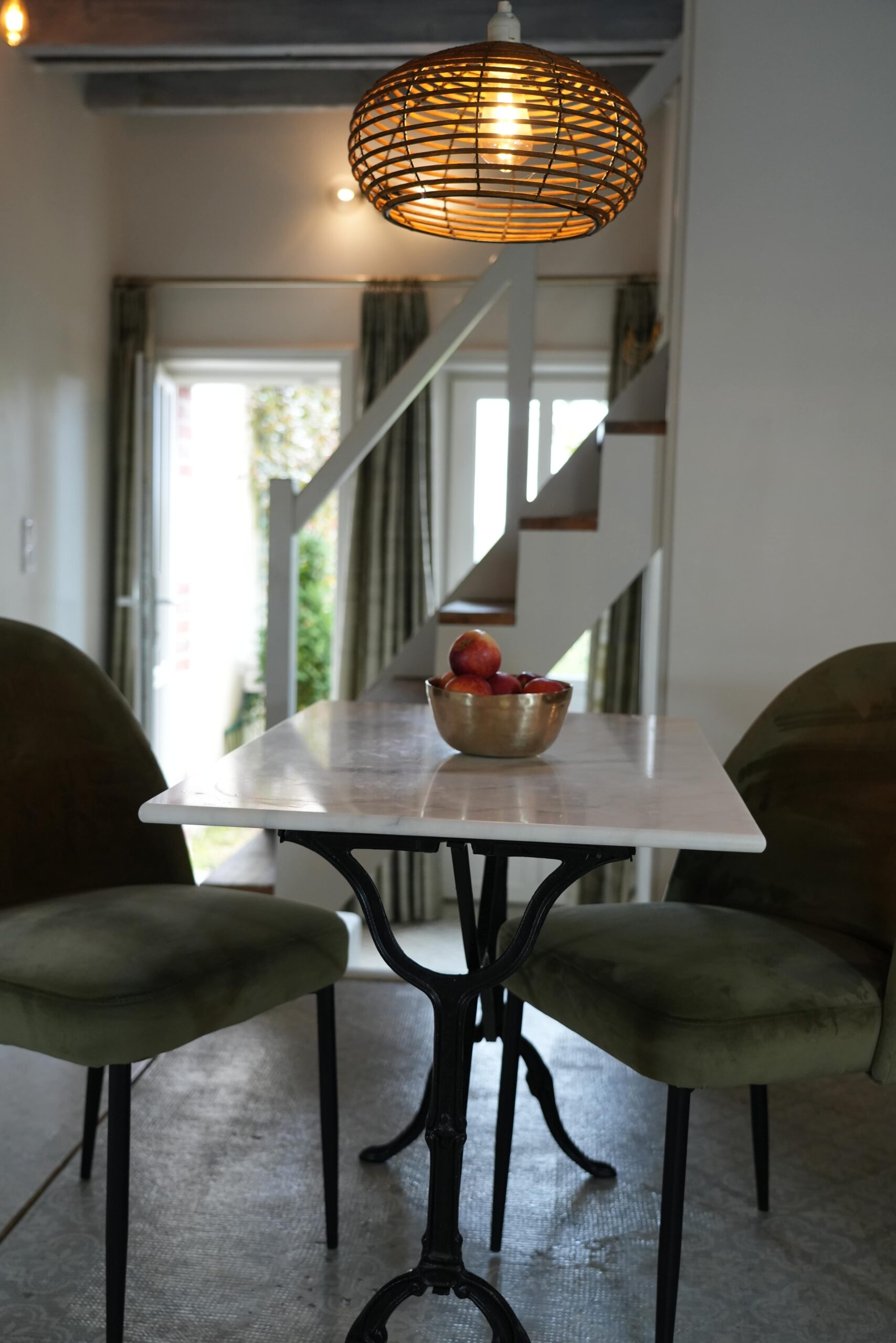 Originally the service quarters, this completely renovated two-story private cottage maintains its original rustic charm. The open floor plan on the ground floor has a cozy aesthetic. To keep the space light and airy, the exposed wood beams were covered in a traditional lime wash. The private entrance and kitchenette allow guests total independence while direct access to the classic French garden affords sweeping views of the Loire Valley. The vaulted ceiling in the bedroom suite upstairs gives the impression of spaciousness. A small bathroom features an Art Deco period vanity and modern walk-in shower.