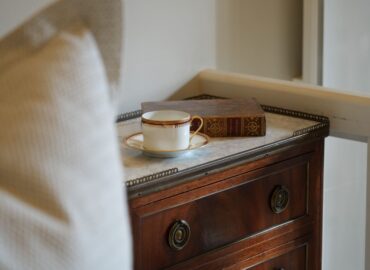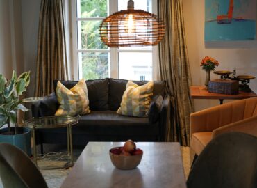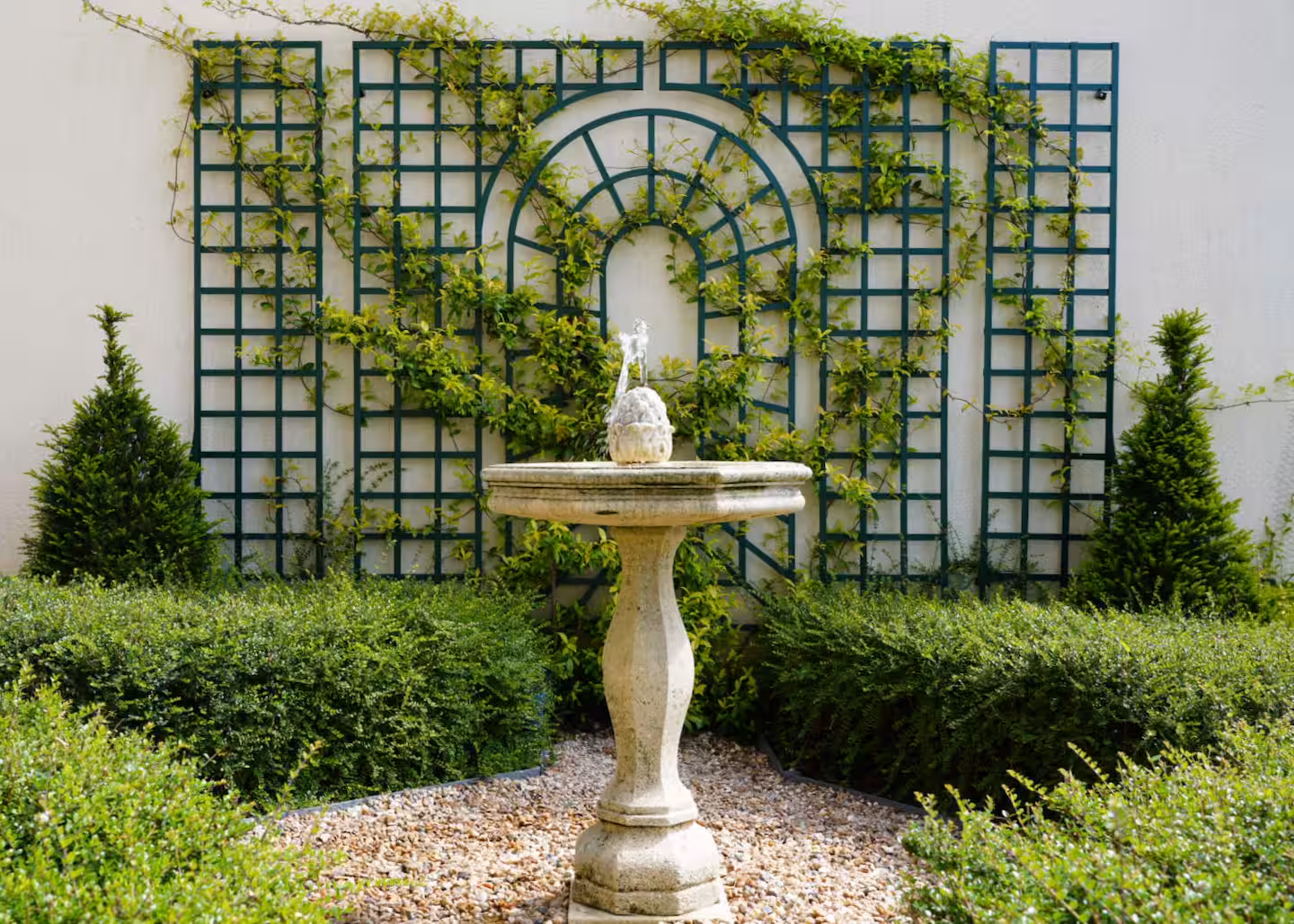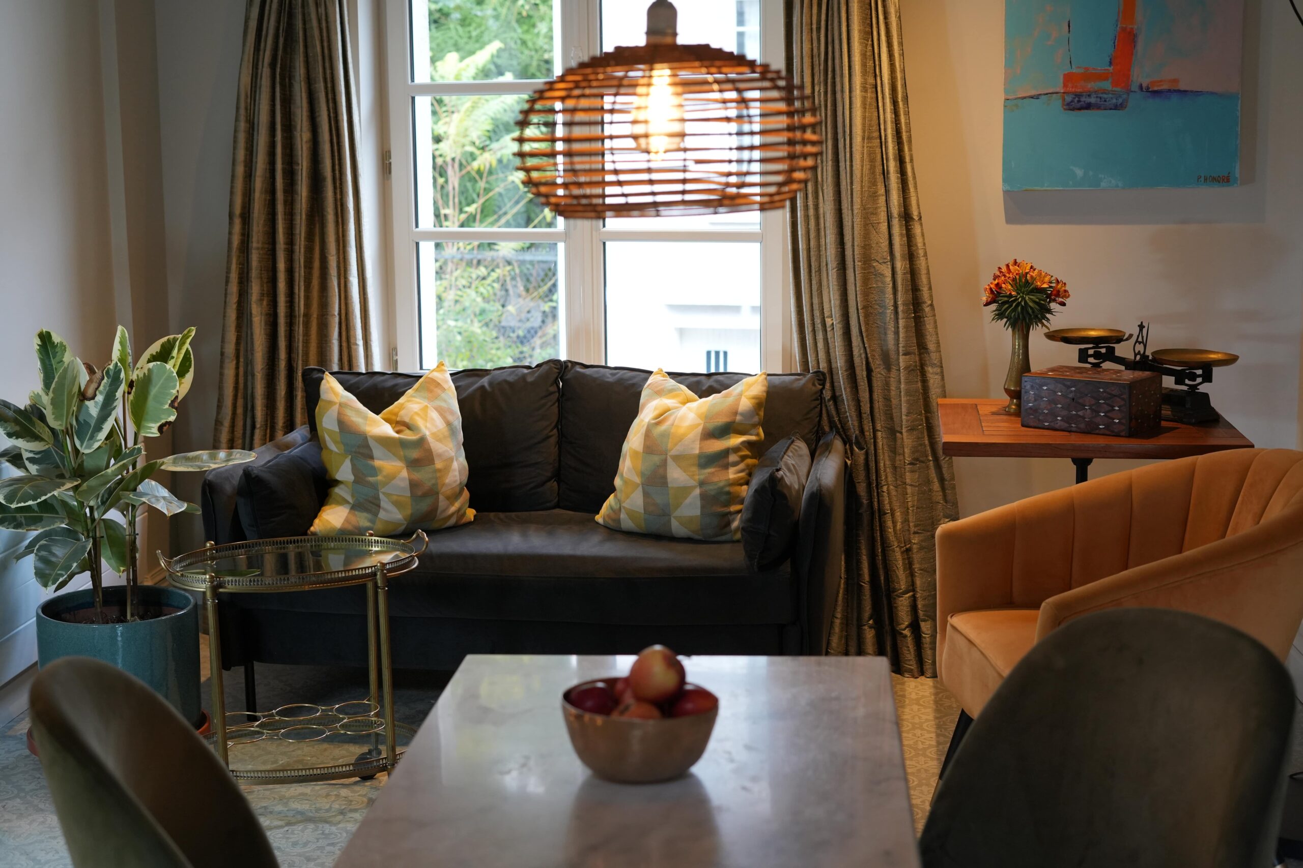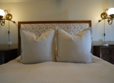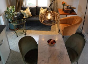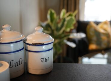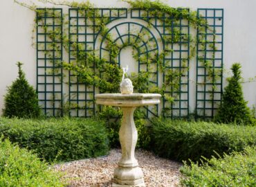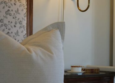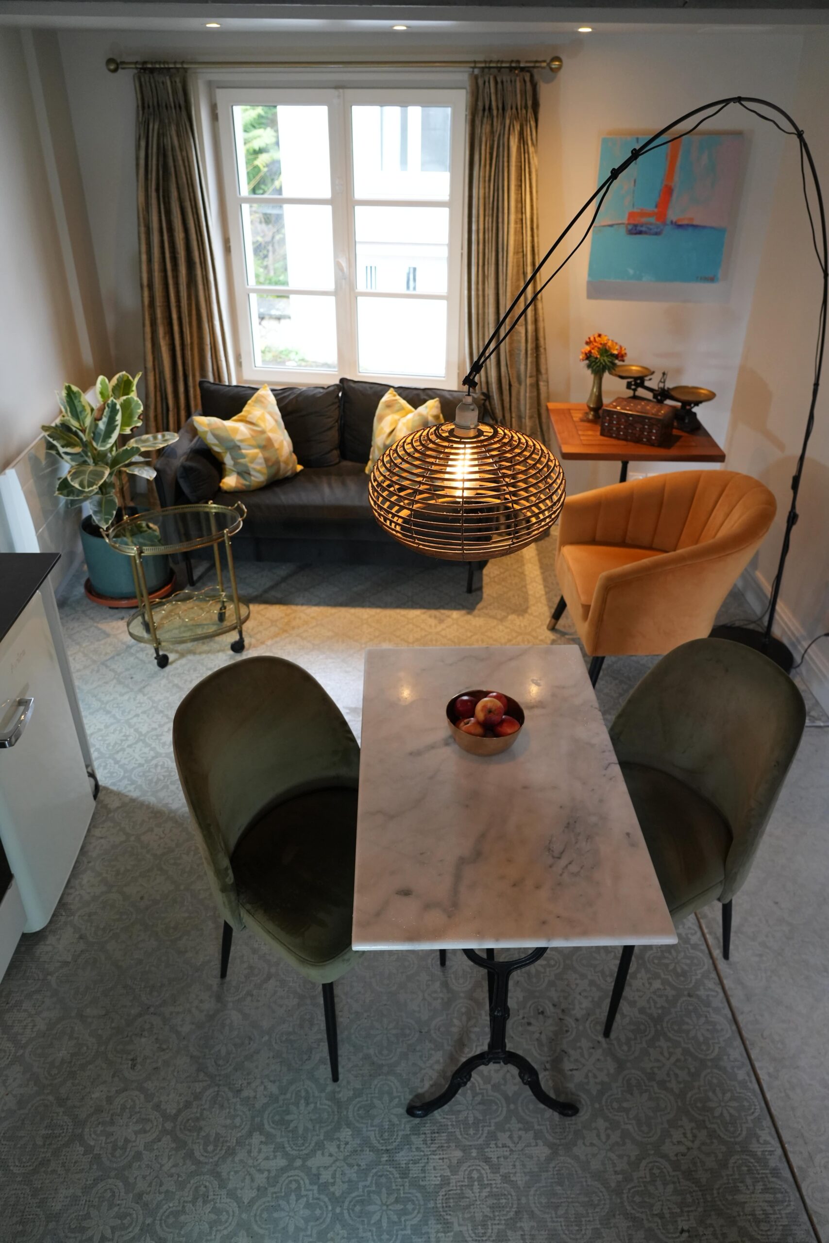 Originally the service quarters, this completely renovated two-story private cottage maintains its original rustic charm. The open floor plan on the ground floor has a cozy aesthetic. To keep the space light and airy, the exposed wood beams were covered in a traditional lime wash. The private entrance and kitchenette allow guests total independence while direct access to the classic French garden affords sweeping views of the Loire Valley. The vaulted ceiling in the bedroom suite upstairs gives the impression of spaciousness. A small bathroom features an Art Deco period vanity and modern walk-in shower.